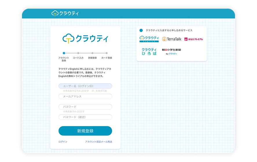 [ユーザー名][メールアドレス][パスワード]を入力し、[新規登録]をクリックしてください。