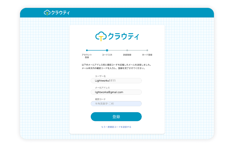 ご登録いただいたメールアドレス宛に認証コードがとどきます。届いた認証コードを入力し、[登録]をクリックしてください。