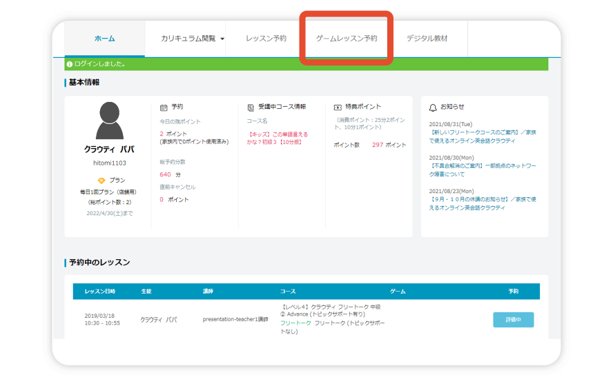 クラウティEnglishの会員マイページでは、現在のプラン・予約時間・受講中コース・予約回数・家族会員の使用ポイント数などの基本情報を確認できます。
