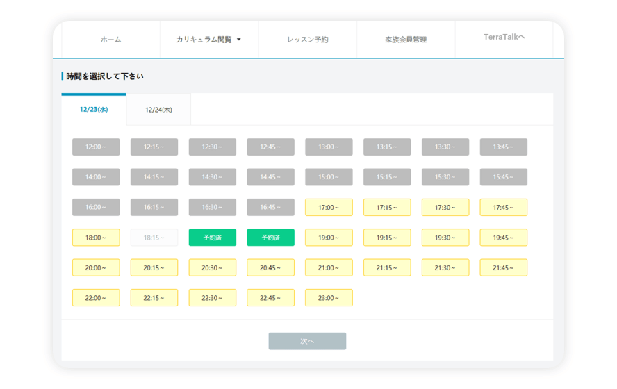 黄色で表示されている時間枠がレッスン予約可能時間です。ご希望の時間をクリックし、「次へ」を押してください。