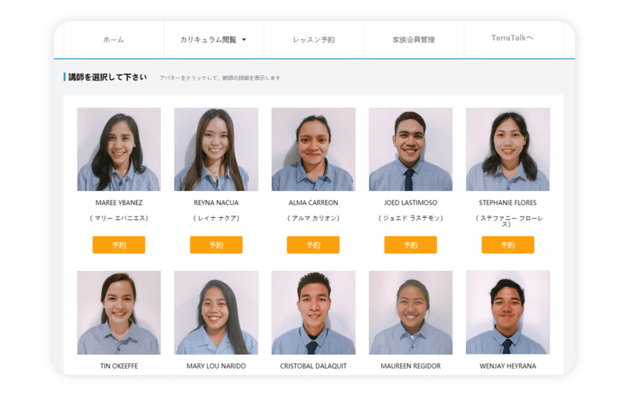 表示されている講師が、ご希望のレッスン時間に予約が可能な講師です。お好きな講師をの「予約」ボタンをクリックしてください。