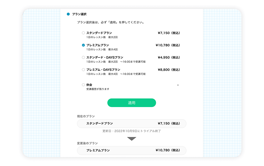 無料トライアルから有料会員に移行する際、お好きなプランをお選びいただけます。有料会員への移行をご希望の方は、無料トライアル期間中に[契約管理]より、ご希望のプランをご選択ください。