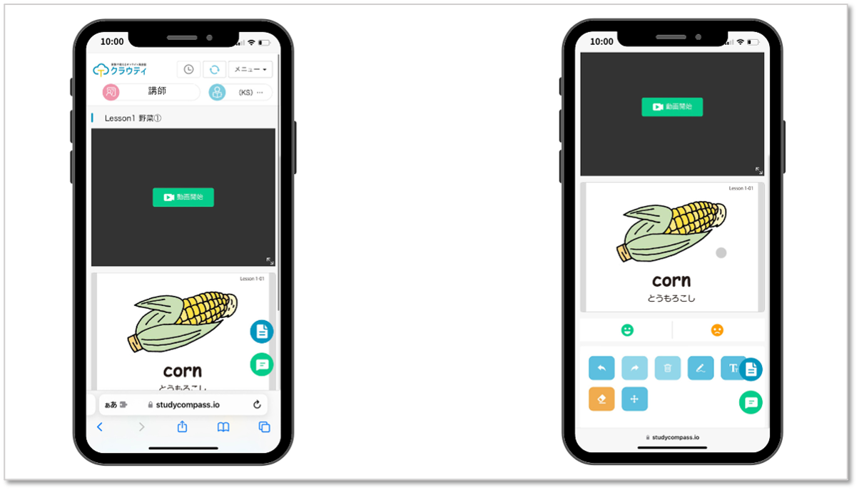 これまでのiPhoneを横向きにした画面デザインに加えて、iPhoneを縦向きにしたデザインでも受講できるようになりました。講師とテキストが縦に並び、1画面に収まります。