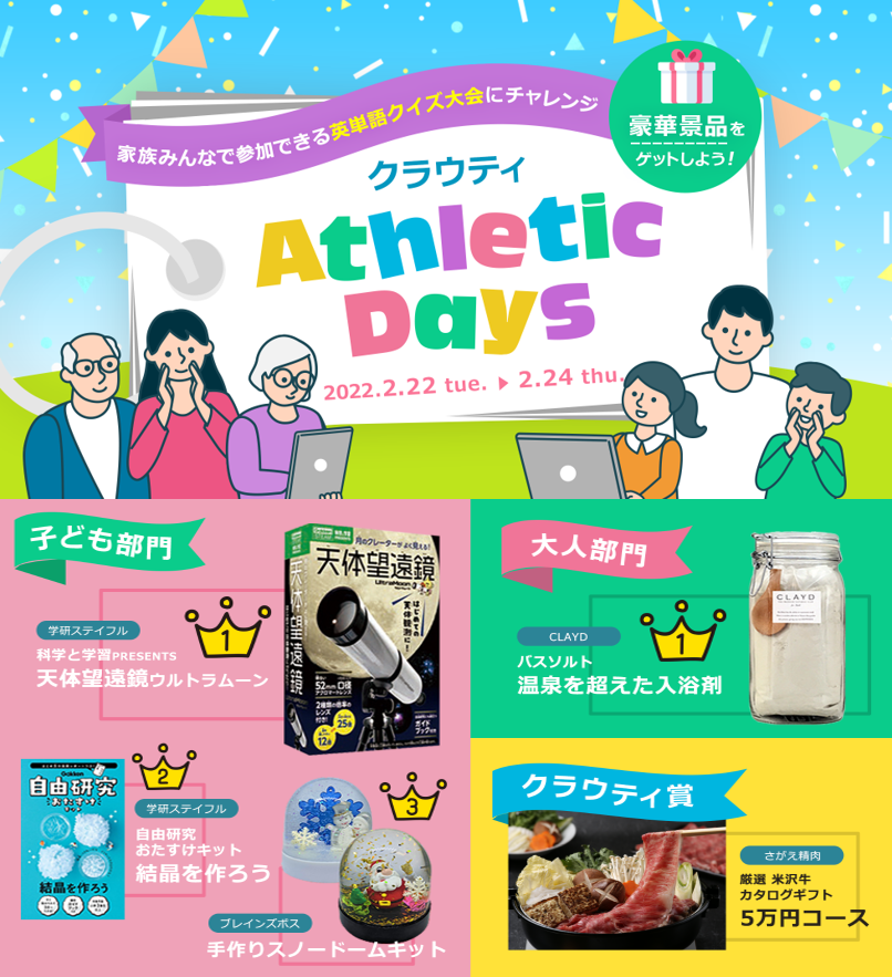 この度、ご家族での参加で5万円分の米沢牛カタログギフトなど豪華景品を獲得するチャンスがある、英単語クイズ大会『クラウティAthleticDays』を開催させていただきます。