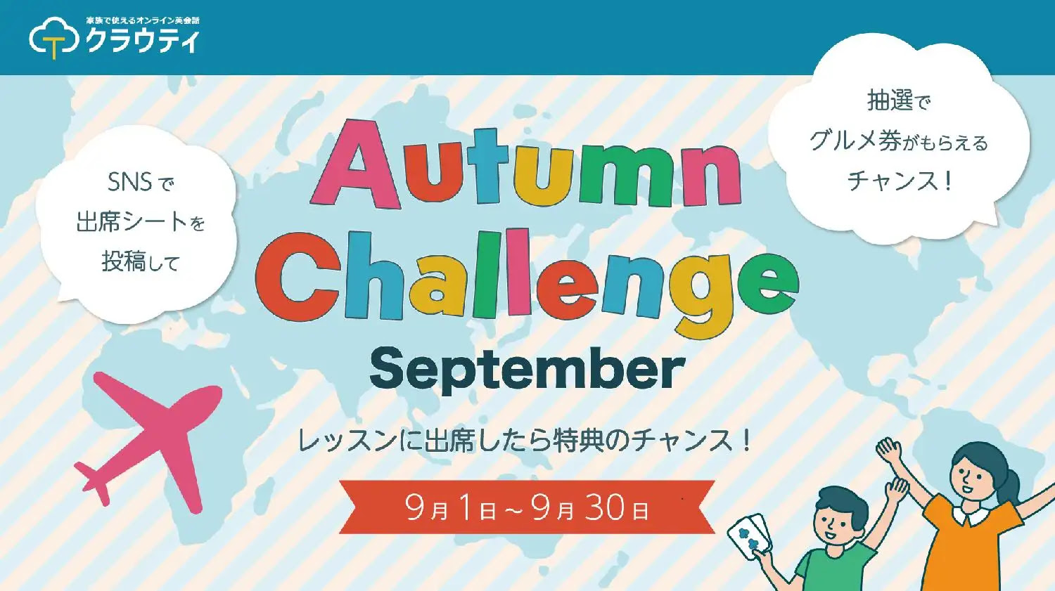 家族で使えるオンライン英会話 クラウティ事務局好評につき9月も開催!レッスンを習慣化して景品をゲットしよう。クラウティAutumnチャレンジsepのお知らせ