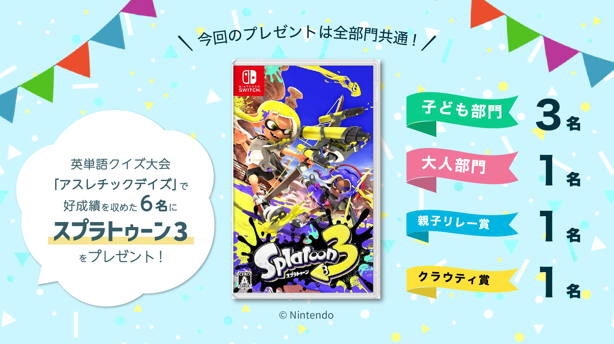 景品はなんと!人気のスプラトゥーン3となります!是非ご家族で特訓の上、景品ゲット目指してご参加ください!