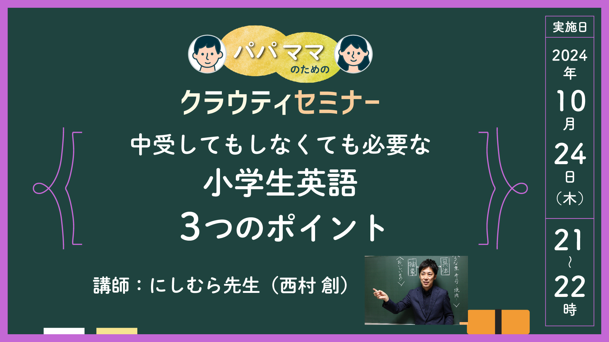 10/24(木)パパママのためのクラウティセミナー開催! 中受してもしなくても必要な小学生英語 3つのポイント