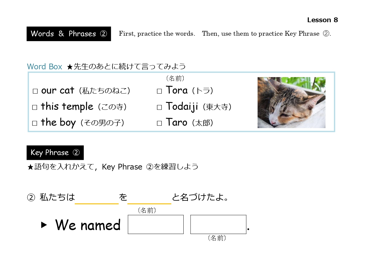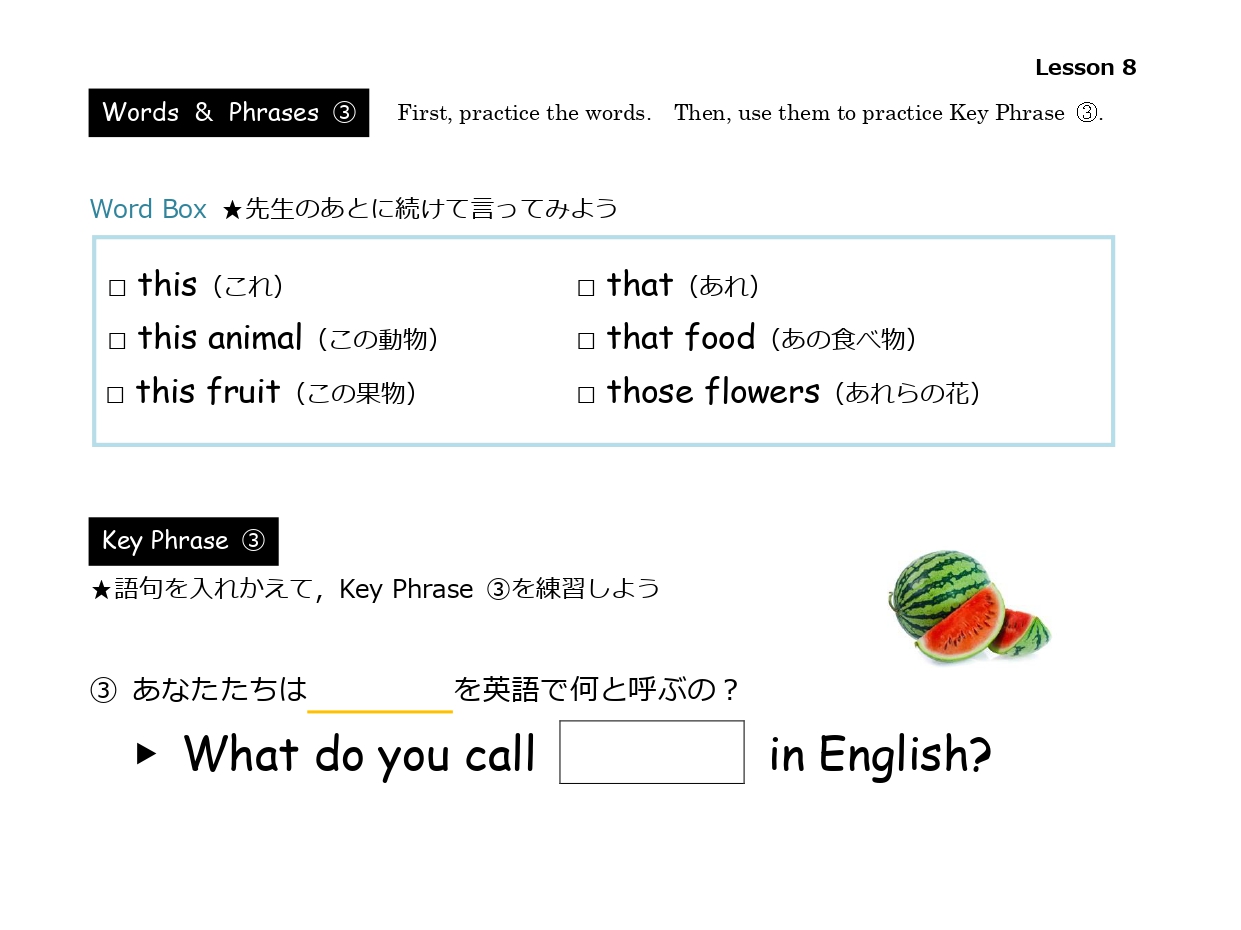 ランダムに中1レベル~中2レベルで学習する文法単元を中心としたレッスン構成です。キーとなるフレーズを繰り返し学習し、学習したフレーズを使用して講師と一問一答形式で会話ができるようになることを目標とします。