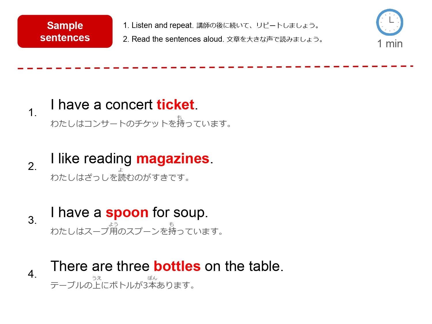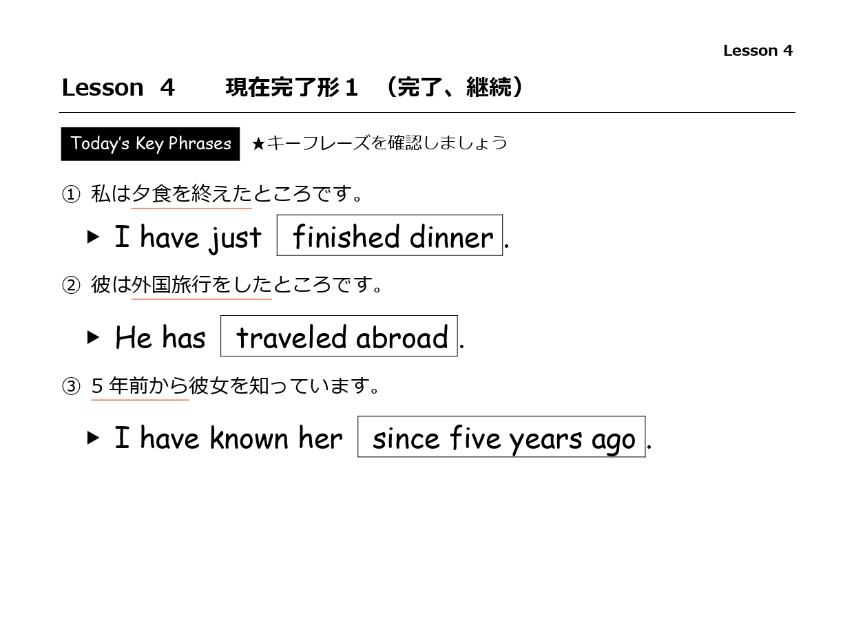 日本語を見て瞬発的に英文に変えられるように、反復練習をするレッスンです。中学生レベルの文法順に構成されていますが、あくまで1フレーズをまるっと形で覚えることに集中した学習スタイルです。