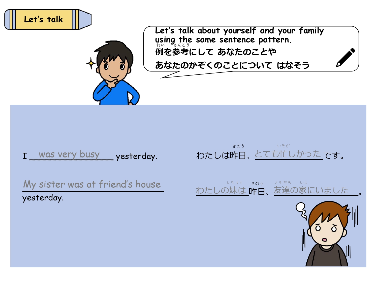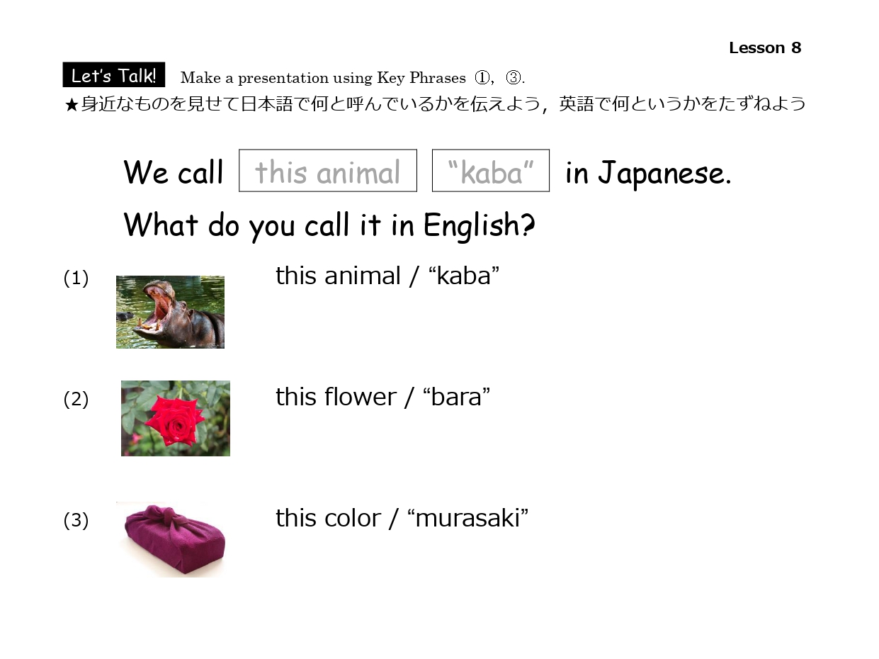 簡単な日本文化の説明や海外の方との会話でよく使うフレーズを、穴埋めやフレーズを入れ替えをしながらシチュエーション別に学習します。