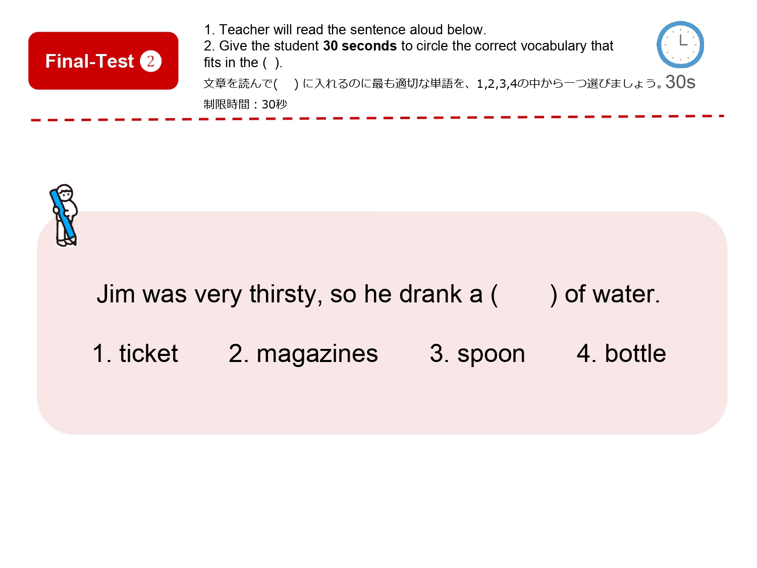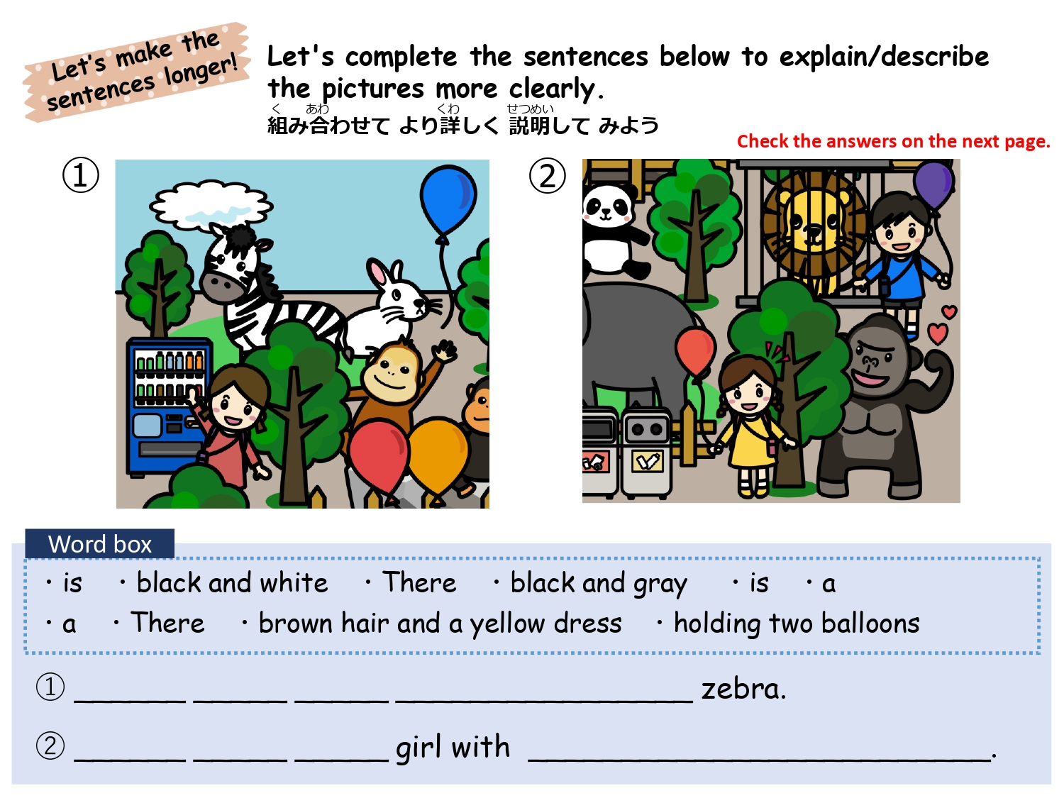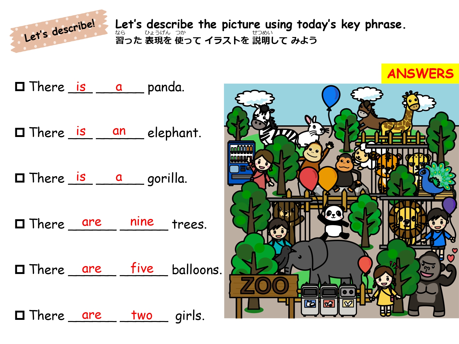 まずは単語を学習した後、イラストのなかから単語の絵がどこにあるか探して遊ぶレッスンです。単語の音とイラストをマッチさせて覚えるほか、数を数えたりクイズに答えたりアクティビティをしながら楽しく単語を学びます。