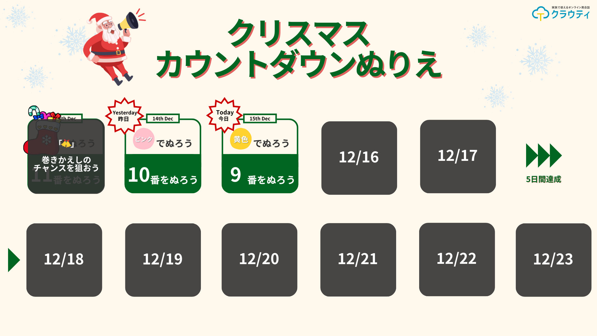 上の画像をみて、クリスマス・カウントダウンぬりえにある数字を、指定された色でぬってみてね♪