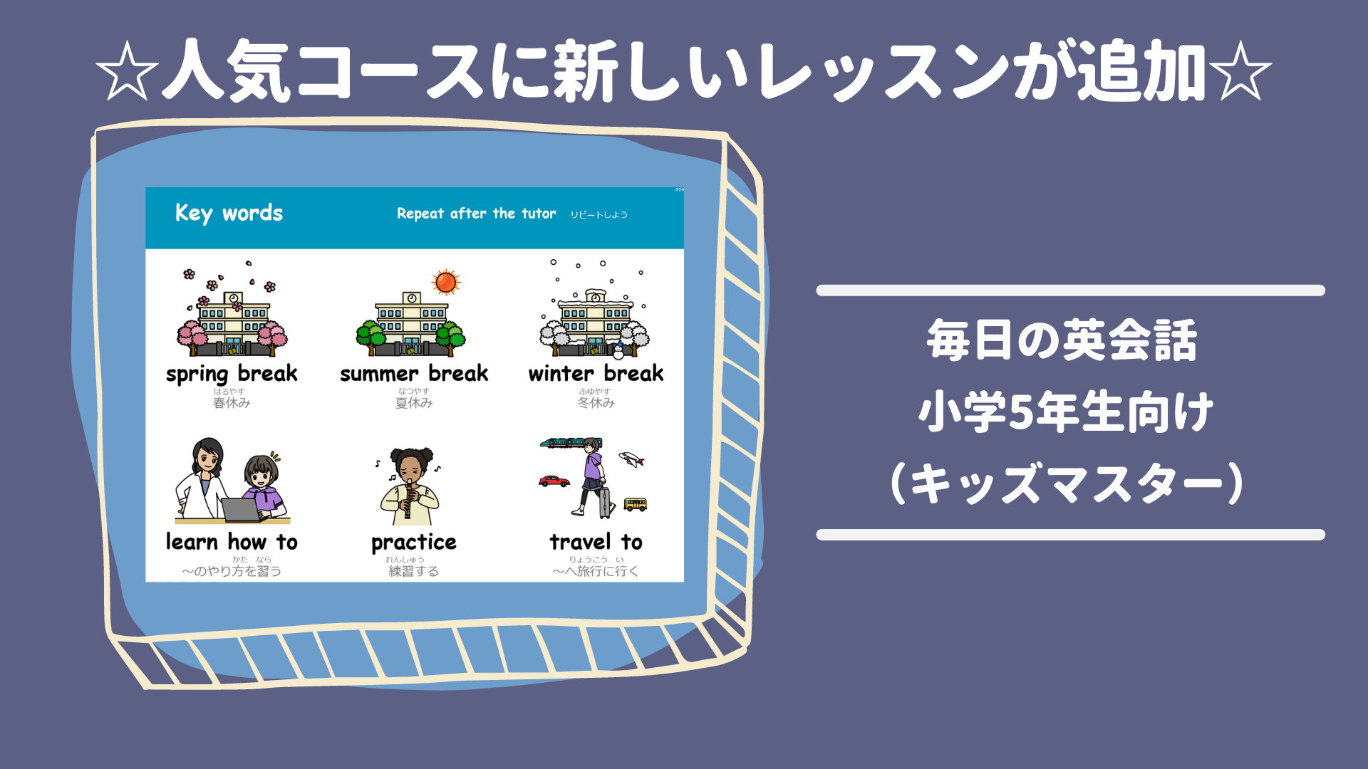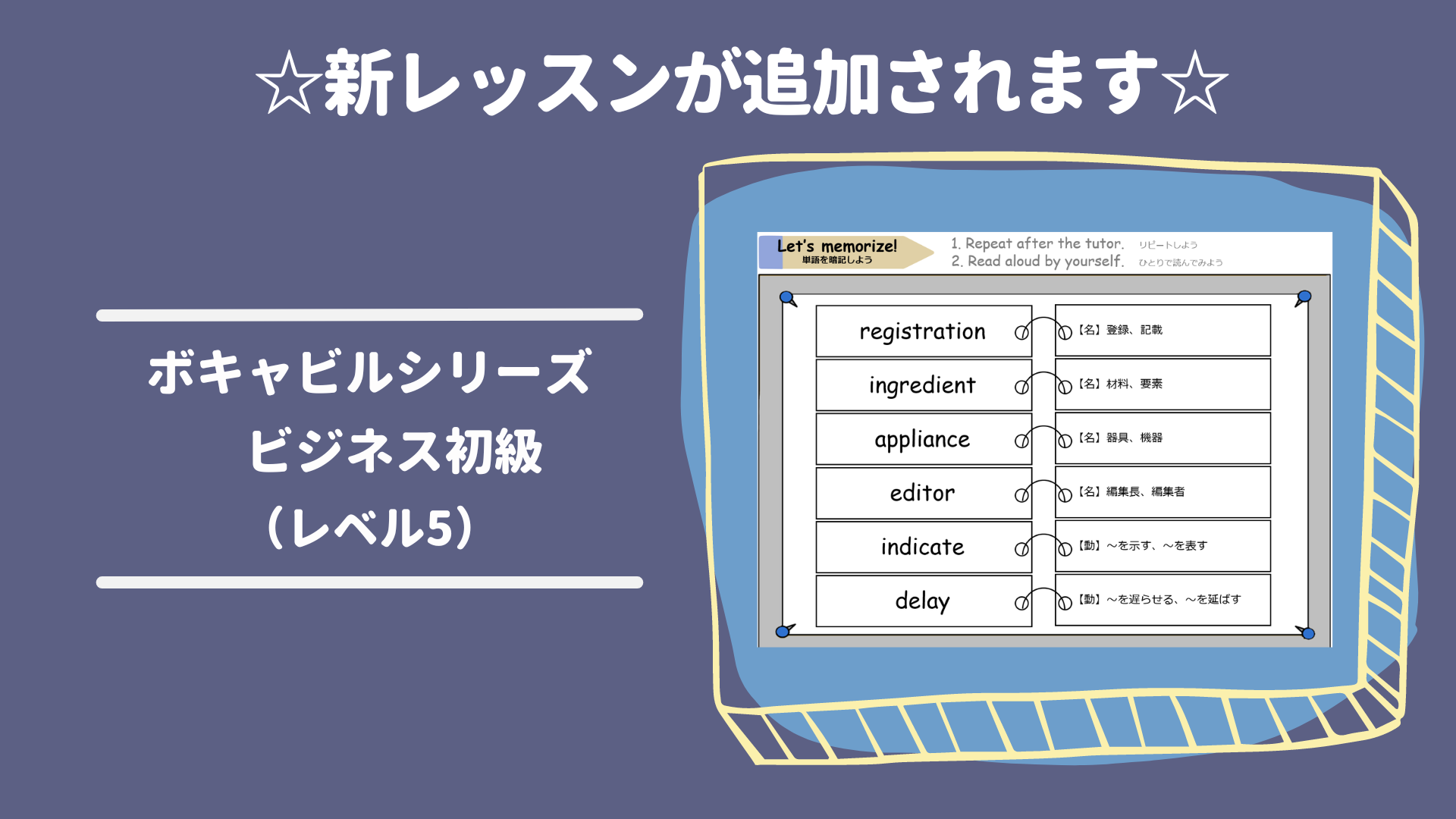 人気の英語試験に必須の英単語を中心に学べるボキャビルシリーズに、新レッスンが追加されます。
