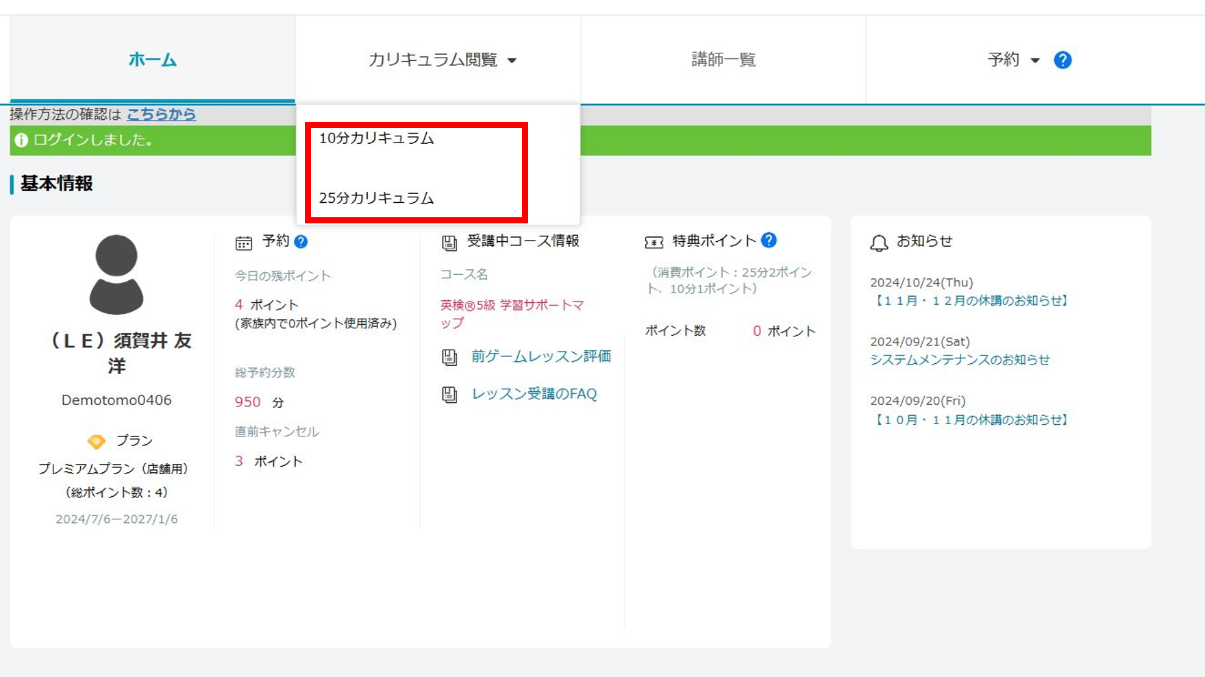 2:クラウティEnglishの画面上部の「カリキュラム閲覧」からご希望のレッスン